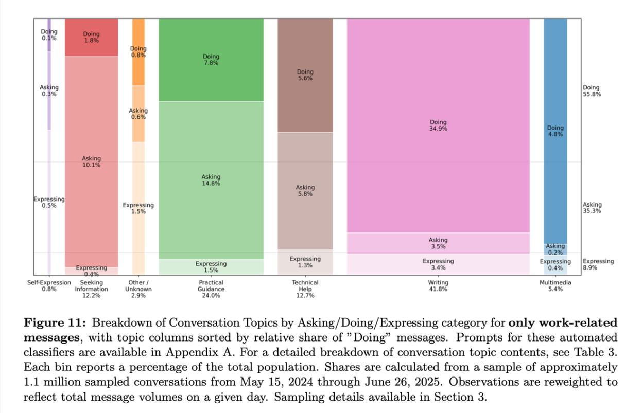 通过将对话内容映射到美国劳工部的职业信息网络,研究发现,无论用户从事何种职业——无论是管理人员、程序员、教师还是销售人员——其工作相关对话都高度集中于两大核心功能:信息处理(包括获取、解释和记录信息,占42%)和决策与创造(包括做决策、创造性思考和提供建议,占32%)。