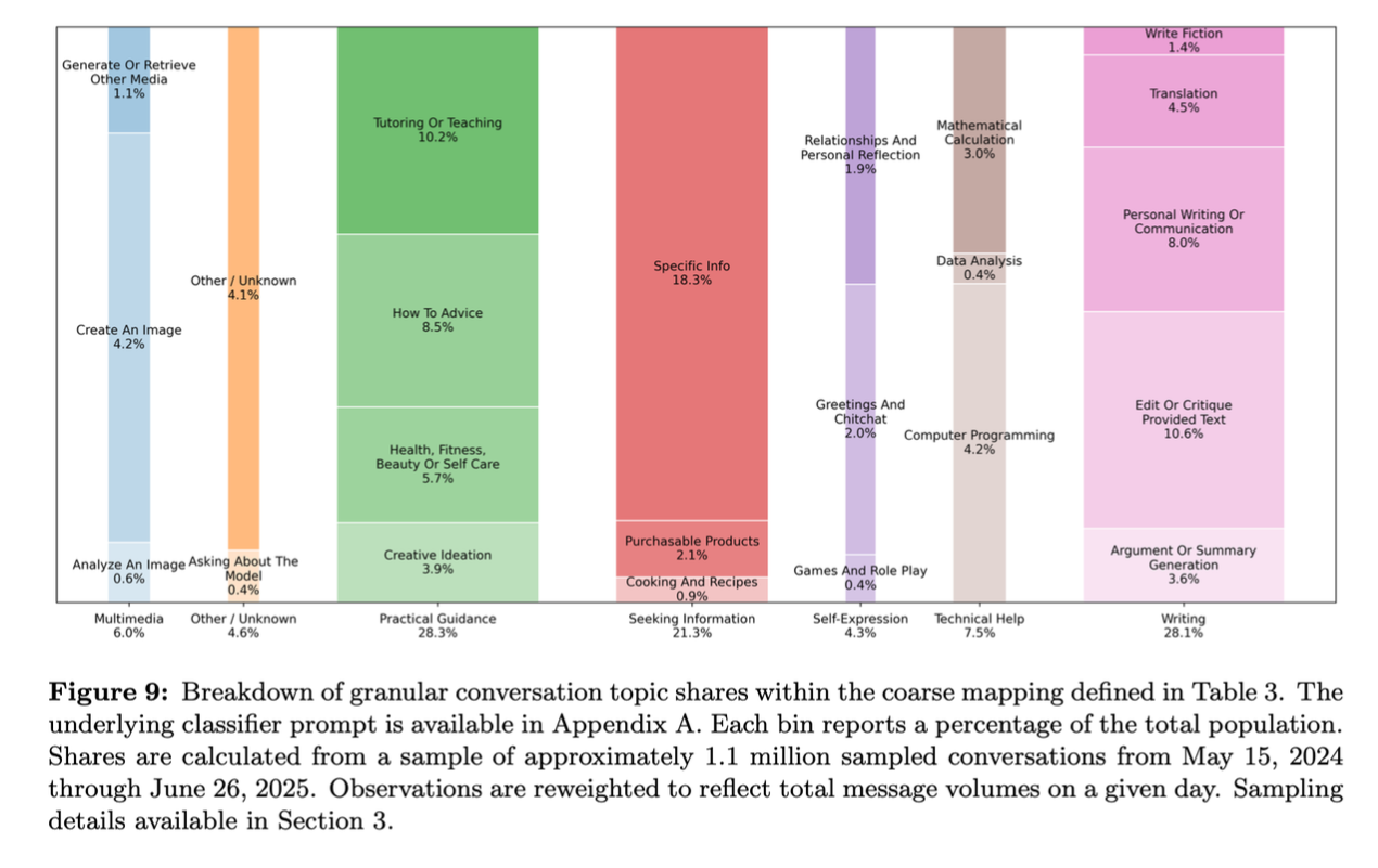 一个关键发现是,约三分之二的写作请求是要求AI修改、润色或总结用户提供的现有文本,而非从零创作,这凸显了其作为“文本协作者”的核心价值。相比之下,计算机编程相关对话仅占4.2%,情感陪伴类对话仅占1.9%,远低于外界预期。