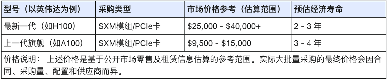 高性能 GPU 的市场价值波动大,但其预估经济寿命通常较短: