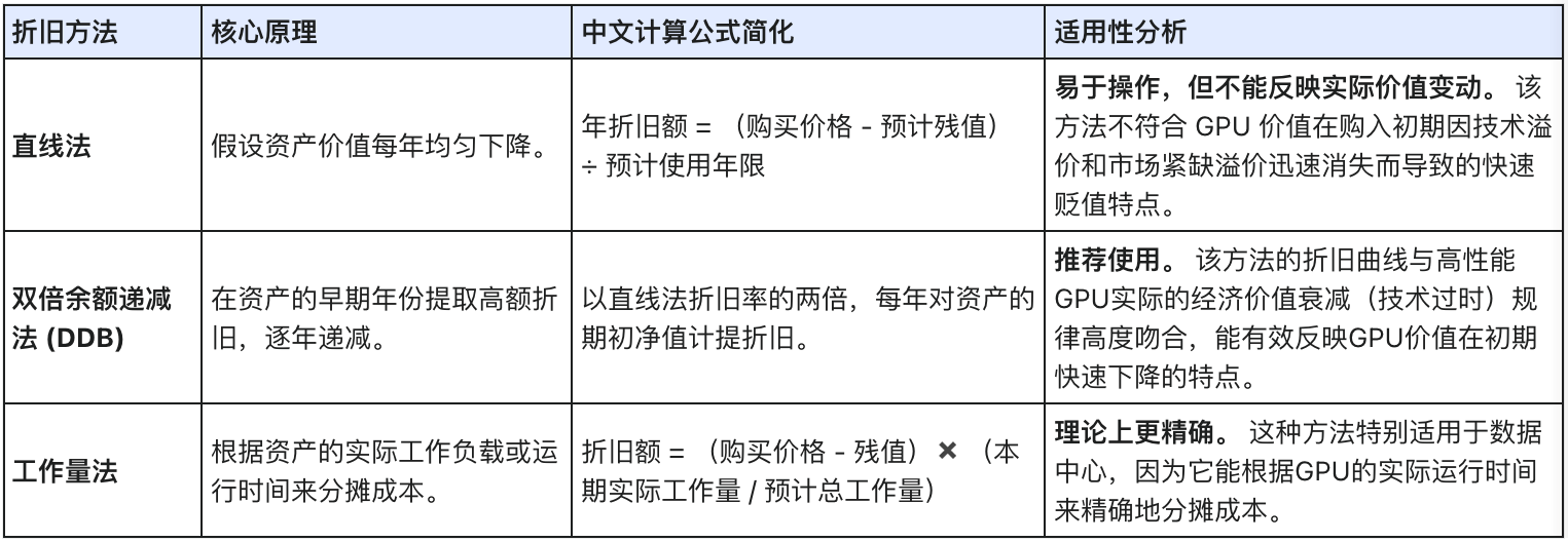 总结: 这一计算过程表明,GPU 的技术更新速度远超传统资产的折旧规律。 采用 DDB 法意味着,在 GPU 投入使用后的前两年,其价值已经损失了 75%。企业必须考虑到更短的经济寿命,以应对技术过时带来的资产风险。