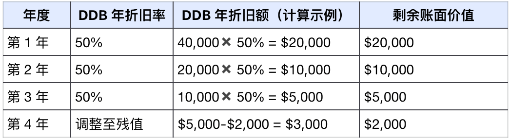 假设一张高性能 GPU 的购买原值为 $40,000,并设定其经济寿命为 4 年(DDB 年折旧率 50%,预计残值 $2,000,对于高科技硬件和机器设备,预计残值通常设定为原值的一个百分比,以覆盖其作为二手零部件、废料或进入低端市场的价值。这个百分比通常在 3%到 10%之间):