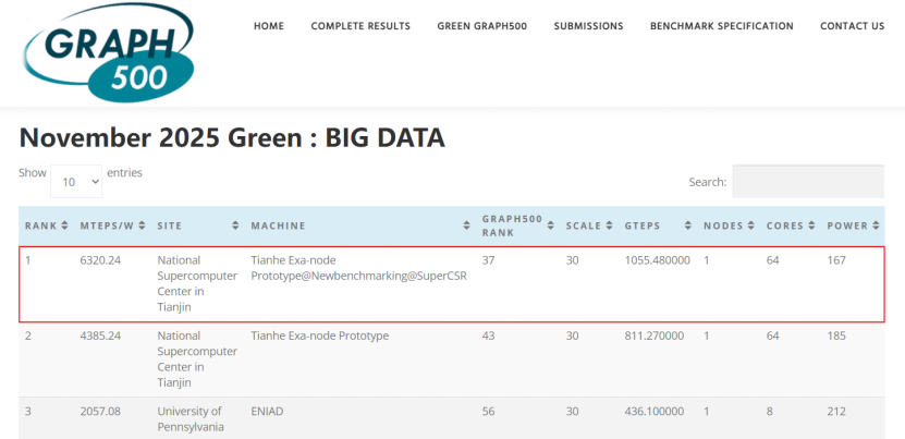Graph500排行榜于2010年首次发布,是国际上评价超级计算机图计算性能的最权威榜单,主要针对当前热门的数据密集型应用,如人工智能、大数据处理等实施评测,可充分体现超级计算机的访存和通信性能,直接反映超级计算机的数据处理能力。
