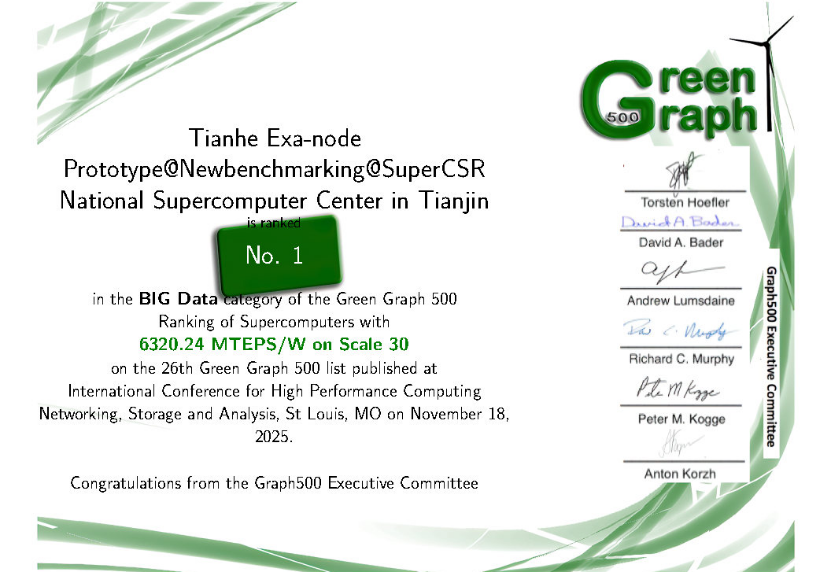 近日,国际权威超级计算机榜单Graph500 最新结果正式公布,由国防科技大学计算机学院牵头,联合国家超级计算天津中心(以下简称“天津超算中心”)等研制的“天河”新一代超级计算机系统以6320.24 MTEPS/W 的性能再次夺得Big Data Green Graph500(Green Graph 500大数据图计算能效)榜单世界第一,这是第12次取得这一优异成绩,以硬核实力彰显中国超算的国际领先地位。