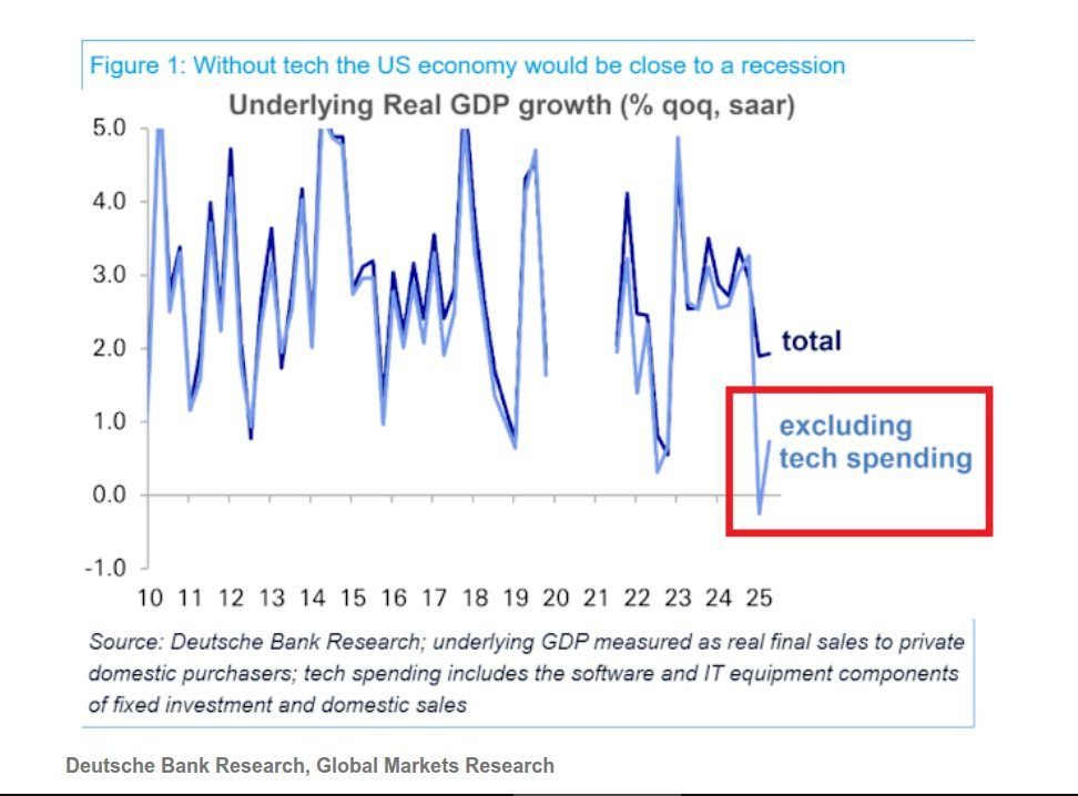 德意志银行的图表清楚地表明了这一点:总体 GDP 增长是正的,但一旦排除科技因素,就会下降到 0%。