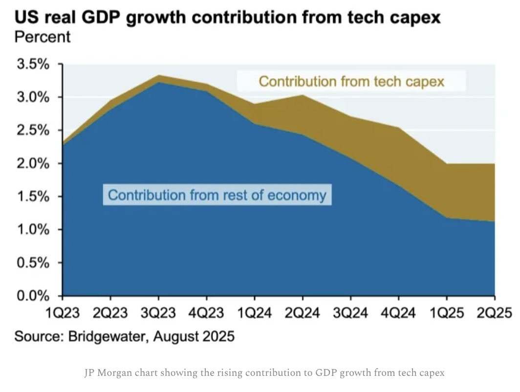 如果剔除技术相关投资,尤其是人工智能驱动的数据中心、芯片和软件支出,国内需求的潜在增长趋势将降至接近 0%。这是因为其他商业和消费者需求要弱得多,因此技术资本支出承担了大部分重担。