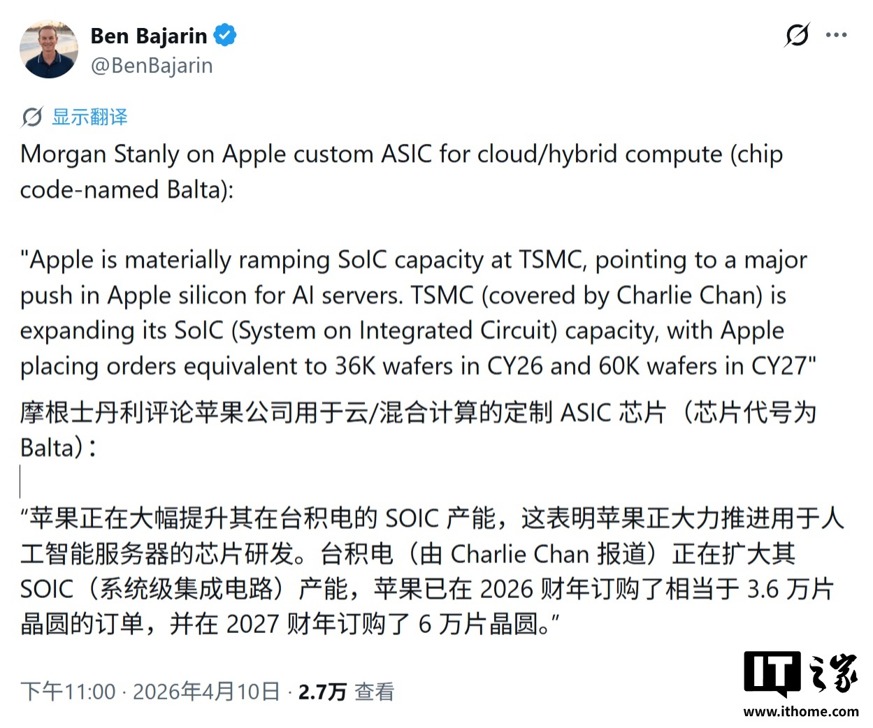IT之家4月11日消息,摩根士丹利分析师最新研报指出,苹果公司大幅扩充台积电SoIC(系统集成芯片)封装产能预订,2026年预订3.6万片晶圆,2027年增至6万片。