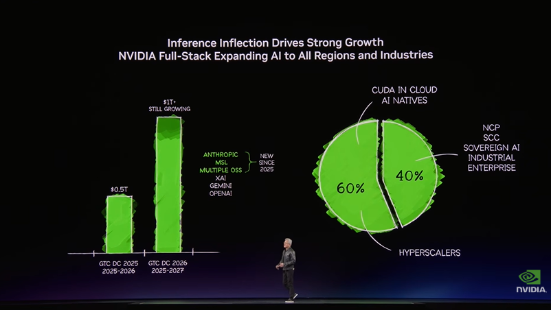 现在我站在这里告诉大家,在GTC DC结束几个月后,也是去年GTC之后的一年,我预见截止到2027年的需求至少将达到1万亿美元。这非常合理,也正是我接下来要探讨的核心。事实上,由于计算需求会远高于这个数字,我们的供应仍将面临短缺。