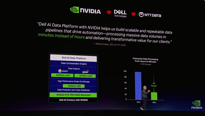 NVIDIA不仅加速云端的数据处理,也加速本地的数据处理。如大家所知,Dell是全球领先的计算机系统制造商和存储提供商。他们与我们合作创建了Dell AI数据平台,集成了cuDF和cuVS。这是他们与NTT DATA合作的一个例子,实现了巨大的性能提升。