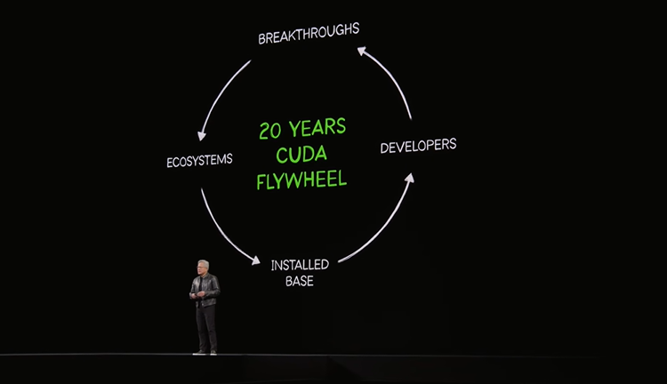 25年前,我们发明了可编程着色器,这是一项让加速器实现可编程性的非凡发明。作为世界上第一个可编程加速器,像素着色器引导我们进行了更深层次的探索。五年后,我们发明了CUDA。这是我们做出的最大投资之一,当时公司几乎无法承受其成本,它消耗了公司绝大部分利润。但我们坚持将CUDA搭载在GeForce显卡上,带给每一台电脑。我们致力于创建这个平台,因为我们深信它的潜力。尽管初期困难重重,但在20年间历经13代产品的更迭,我们最终实现了CUDA的无处不在。