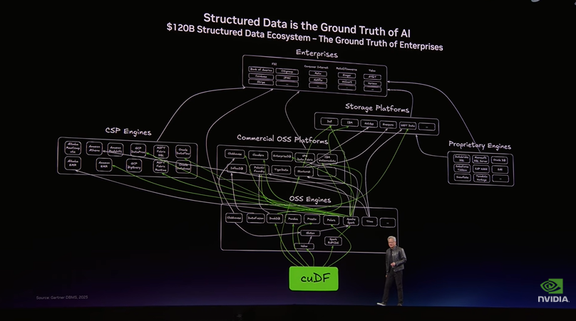 NVIDIA创建了两个基础库。就像我们为3D图形创建了RTX一样,我们为结构化数据创建了cuDF,为向量存储、语义数据和非结构化数据创建了cuVS。这两个平台将成为未来最重要的支柱。我非常激动地看到它们在整个全球数据处理网络中得到应用。数据处理已经存在了很长时间,涉及众多公司和平台,我们花了很长时间才深度集成到这个生态系统中。