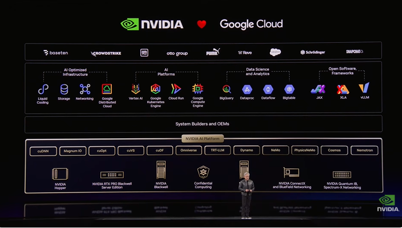 在Google Cloud方面,我们已经合作了很长时间。我们加速了Google的Vertex AI以及非常重要的BigQuery平台。以我们与Snapchat的合作为例,我们将他们的计算成本降低了近80%。当你加速数据处理和计算时,你会获得速度、规模以及最重要的成本优势。这原本被称为摩尔定律。摩尔定律的核心是性能每隔几年翻一番,这意味着在价格不变的情况下,你每年能获得两倍的性能,或者说计算成本在逐年降低。现在,摩尔定律已经力不从心了,我们需要一种新方法。加速计算允许我们实现这种巨大的飞跃。因为我们持续优化算法,NVIDIA本质上是一家算法公司。随着我们不断优化算法,并且凭借庞大的装机量,我们可以为每一个人持续降低计算成本并提高速度。