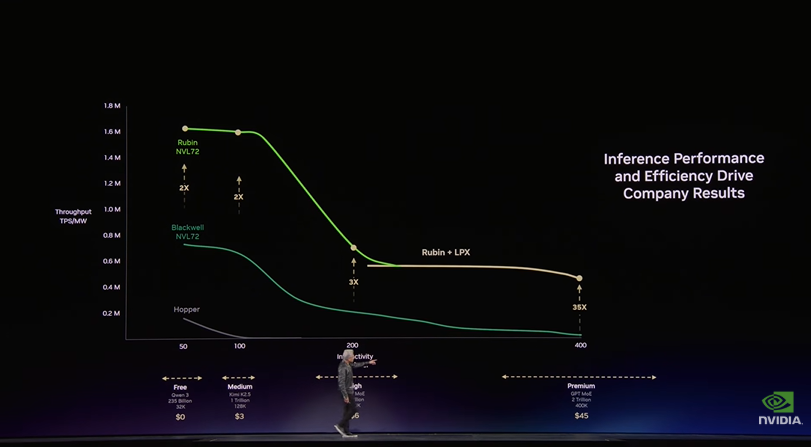 现在我们有了Vera Rubin。我们在每一个层级都提升了吞吐量,特别是在利润最高、价值最大的细分市场,性能提升了10倍。这极其困难,全靠NVLink 72、极低延迟以及极端的协同设计才得以实现。