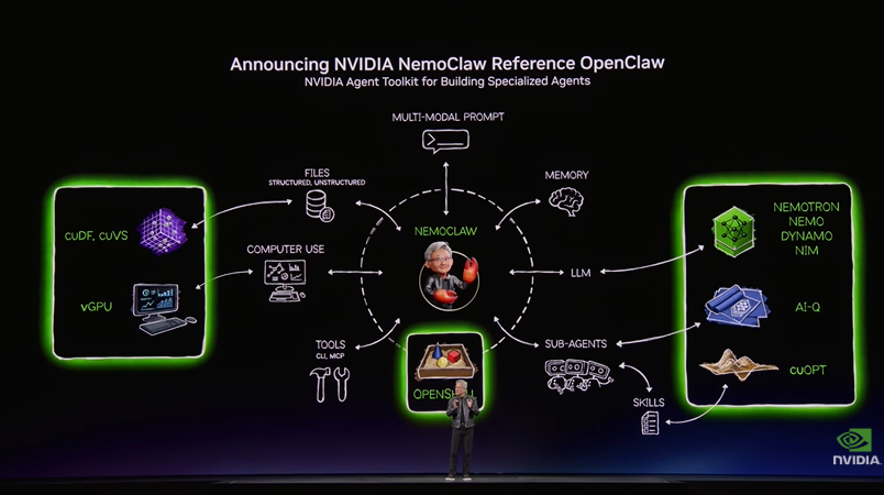 每一家SaaS公司都将转型为GaaS(Agentic-as-a-Service)公司,即智能体即服务公司。OpenClaw在准确的时间为行业提供了所需的开源堆栈。但有一个关键问题,企业网络中的智能体系统具备访问敏感信息、执行代码以及与外部通信的权限。这种风险显然不能被忽视。因此我们与Peter合作,召集了顶尖的安全和计算专家,使OpenClaw具备了企业级安全和隐私保护能力。我们将其称为NVIDIA NemoClaw,它包含了所有智能体AI工具包。其中最重要的Open Shell技术现已集成到OpenClaw中。