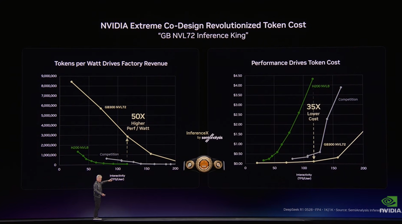 最终,这些努力开花结果。过去常有人说推理很简单,但实际上推理极其困难,且由于直接驱动收入,它也极其重要。根据SemiAnalysis提供的有史以来最全面的AI推理测评结果,在左侧图表中可以看到每瓦Token数这一关键指标。由于数据中心和工厂本质上都受电力供应限制,一座1吉瓦的工厂受物理定律约束很难扩容,因此你必须在有限的电力内产出最多的Token,这才是工厂的核心产出。
