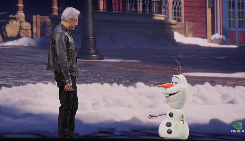 Olaf能够学会走路归功于我们与DeepMind共同开发的Newton求解器,它运行在NVIDIA Warp之上,使机器人能够适应物理世界。你能想象吗?未来的迪士尼乐园里,这些角色机器人四处走动。虽然Olaf比我想象中要矮一些,但他非常聪明。