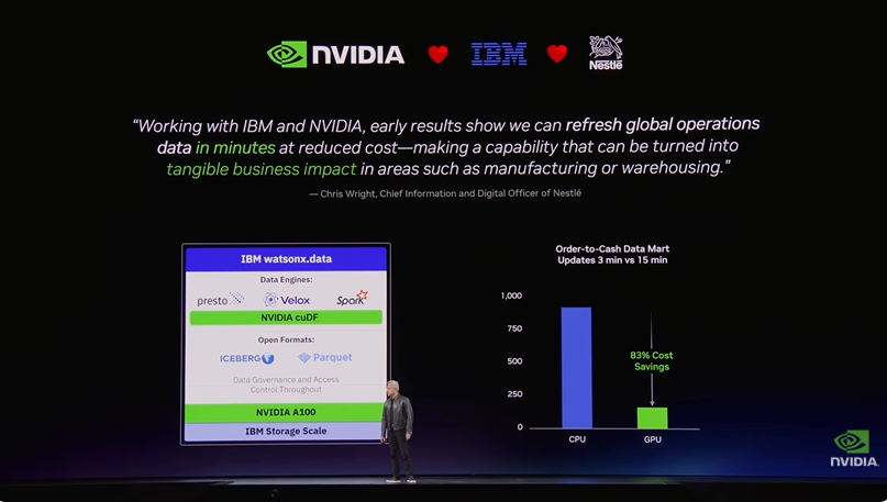 60年前,IBM推出了System/360,开启了通用计算时代。随后SQL语言和数据仓库成为现代企业计算的基石。今天,IBM和NVIDIA正在通过利用NVIDIA GPU计算库加速IBM Watsonx.data SQL引擎,为AI时代重新定义数据处理。数据是赋予AI背景和意义的真实基础。AI需要快速访问海量数据集,而当今的CPU系统已无法跟上步伐。雀巢公司每天要做出数千个供应链决策,通过在NVIDIA GPU上运行加速的Watsonx.data,雀巢能以83%的更低成本将数据处理速度提高五倍。